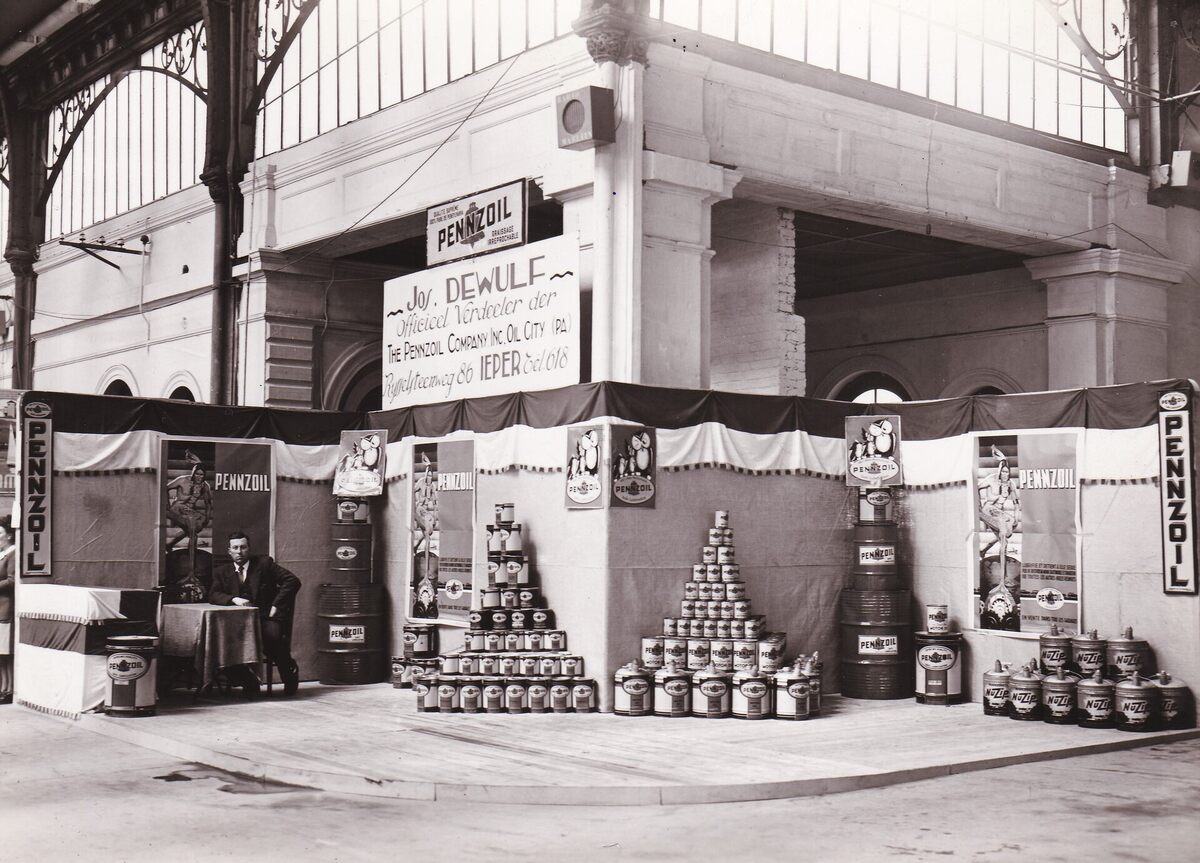 Formaat : 13 x 18 cm. - De stand van de firma Pennzoil, olieproducten, op de handelsbeurs in de Albert hall van het oud station op het Ernest Feysplein.