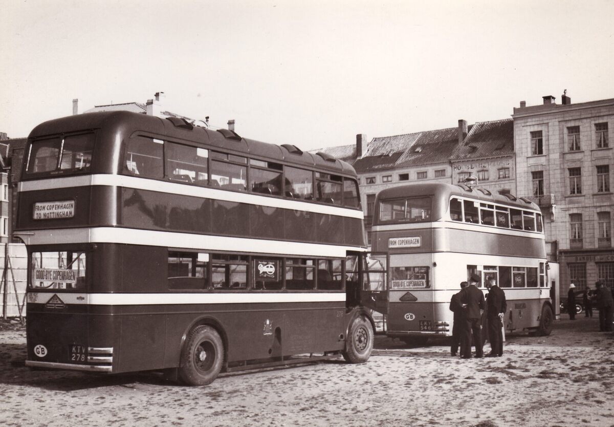 Formaat : 13 x 18 cm. - Britse dubbeldekkers geparkeerd op de gronden van het nog te bouwen Kursaal aan het Monacoplein. De straat op de achtergrond is de Langestraat.