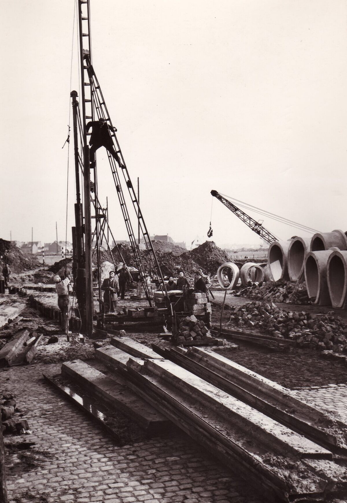 Formaat : 18 x 13 cm. - Inheien van damplanken nabij de oude watertoren.