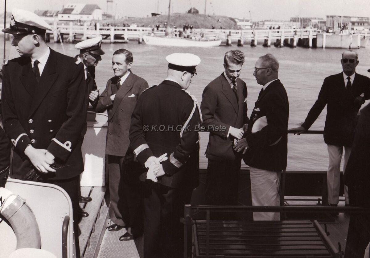 Prins Albert op bezoek te Oostende,in gesprek met een onbekende.Op de rug gezien commodore Lambert ROBINS en derde van links provinciegoeverneur Pierre van OUTRYVE d'YDEWALLE.