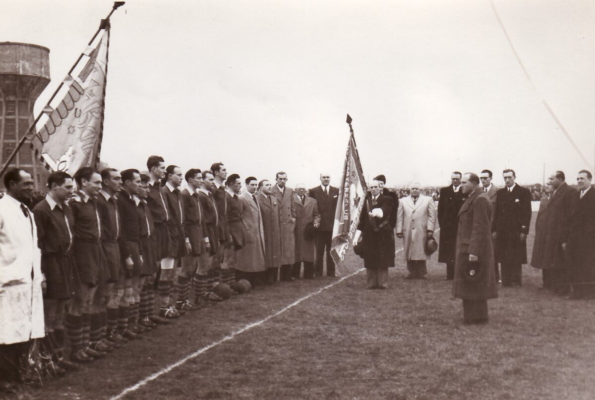 Overhandiging van het nieuw vaandel van voetbalploeg "Hoger Op Oostende" op het terrein van KVGO voetbal. Links de thans verdwenen watertoren.