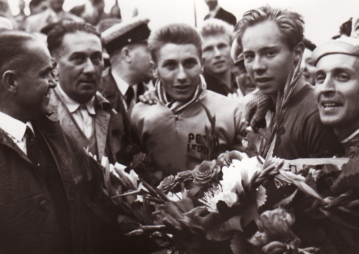 Centraal de gekende Franse renner Jacques ANQUETIL,links burgemeester Adolf VAN GLABBEKE met een winnaar van een wielerwedstrijd te Oostende.