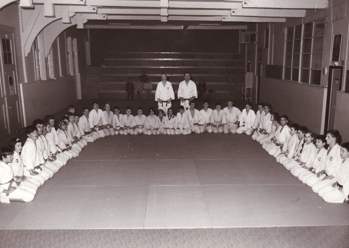 Een groep judoka's in spe in het sportcentrum voor het begin der oefeningen.