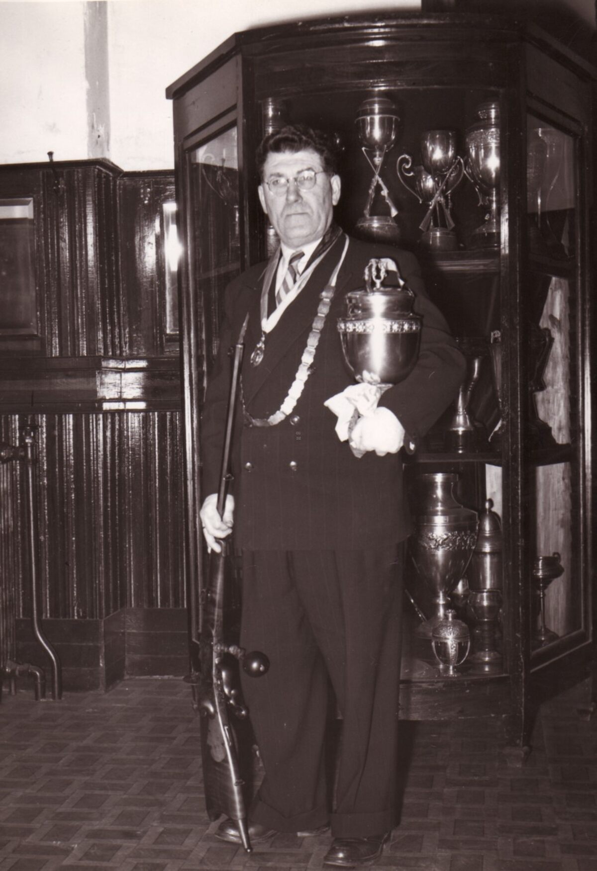 Sire Richard Panesi van de schuttersvereniging "Les Carabiniers" met de gewonnen beker voor de trofeëenkast van deze vereniging. Hij was ook voorzitter van de vereniging en sedert 1954 ook keizer, daar hij driemaal achtereenvolgend het sireschap wist te bemachtigen.