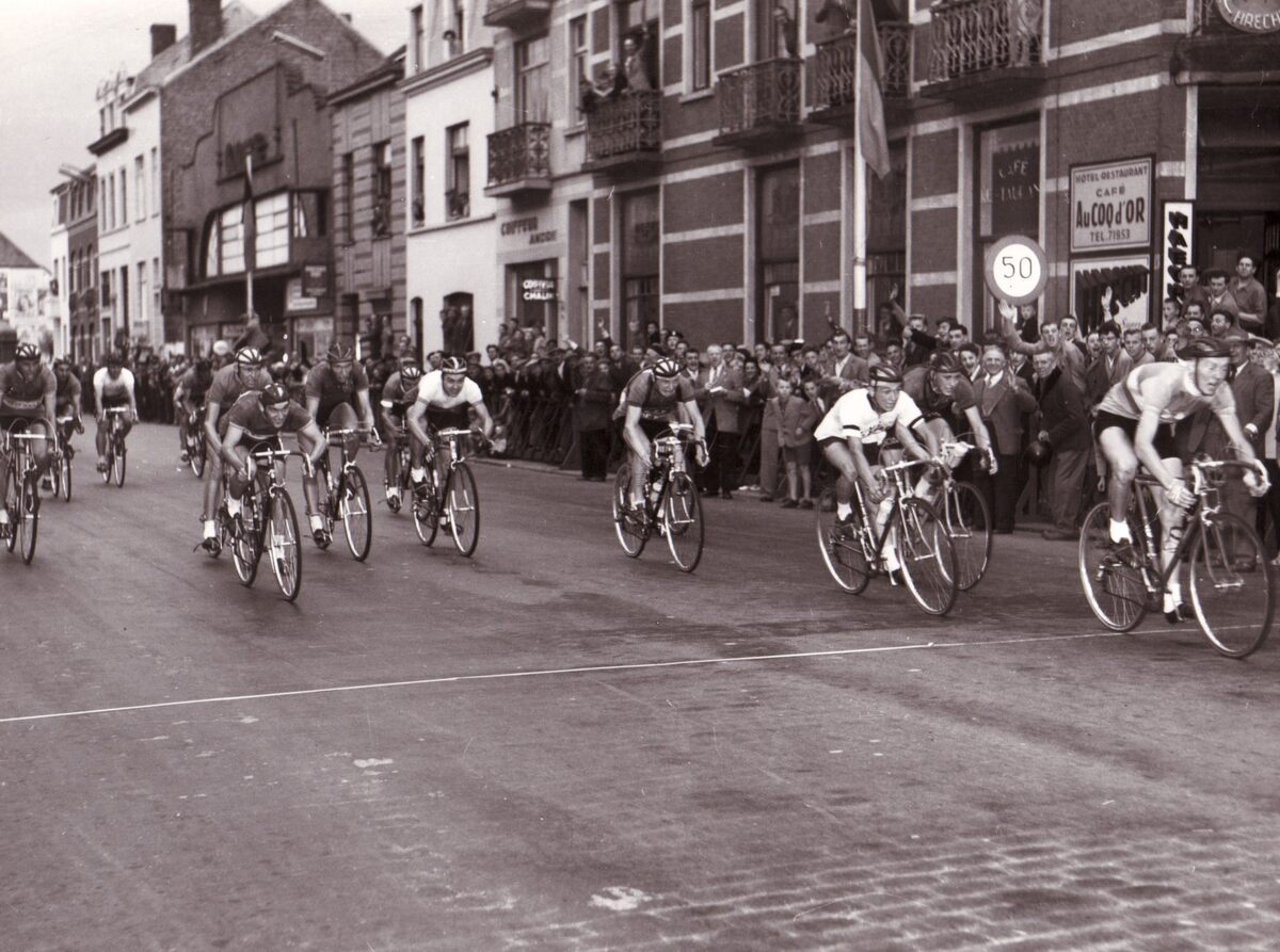 Eindsprint van een wielerwedstrijd op de Nieuwpoortse steenweg ter hoogte van de Aartshertogstraat.