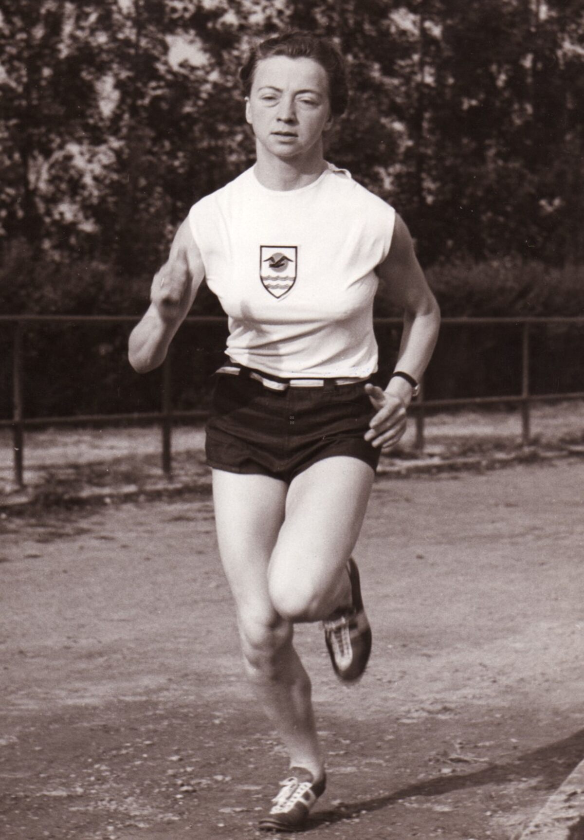 Een athlete op de piste van het Hermesstadion aan de Torhoutse steenweg.
