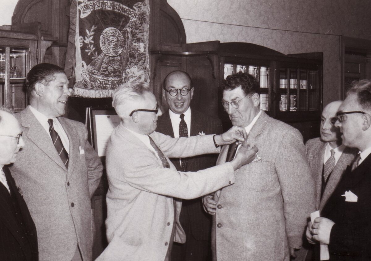 De voorzitter van de schuttersvereniging "Les Carabiniers" spelt Richard PANESI een onderscheiding op in het lokaal van de vereniging.