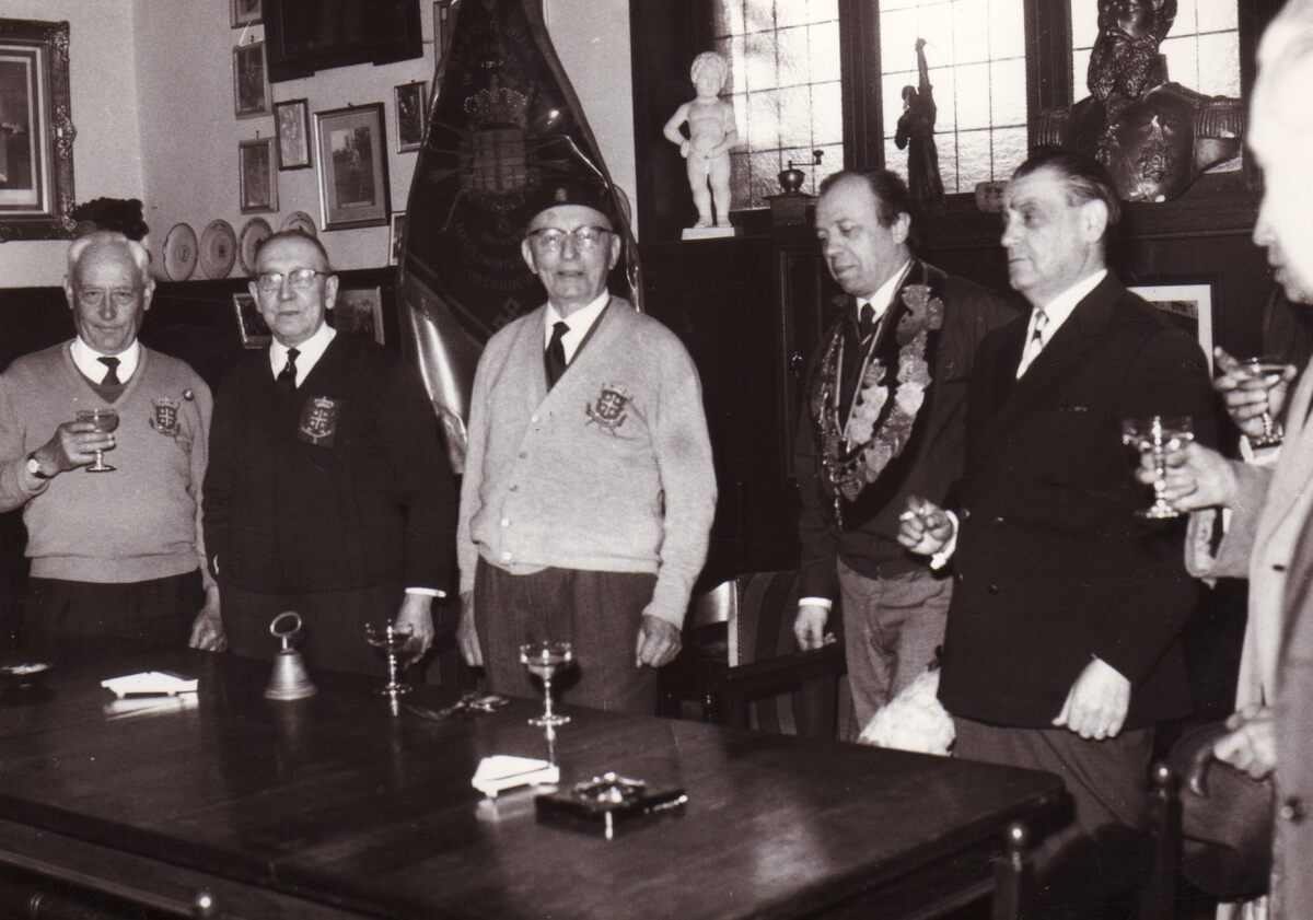 Leden van de Sint-Sebastiaansgilde met hun voorzitter Maurice Wandels in hun lokaal aan de Leffingestraat.