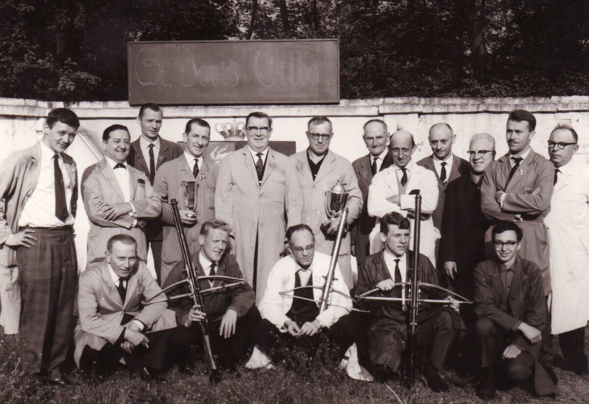 Leden van de balboogschtutters de Sint Jorisgilde na een wedstrijd in hun lokaal Café Armenonville in het Maria-Hendrikapark. Staand links, Laurent Soenen, de later voorzitter van de vereniging.