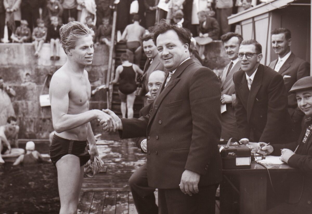 Zwemwedstijd in de vaart Oostende - Brugge aan het Sas te Bredene.Burgemeester August PLOVIE van Bredene feliciteert een winnaar.