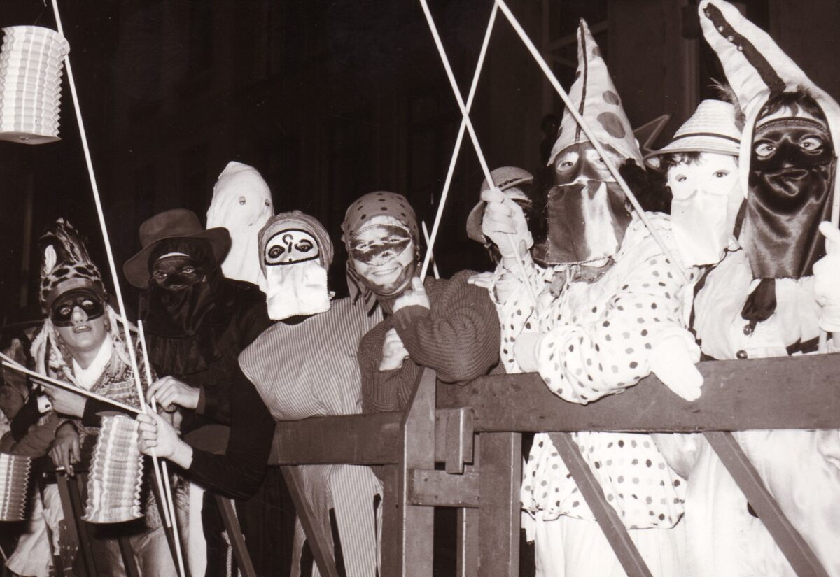 Gemaskerde deelnemers aan de cimanteirenstoet.