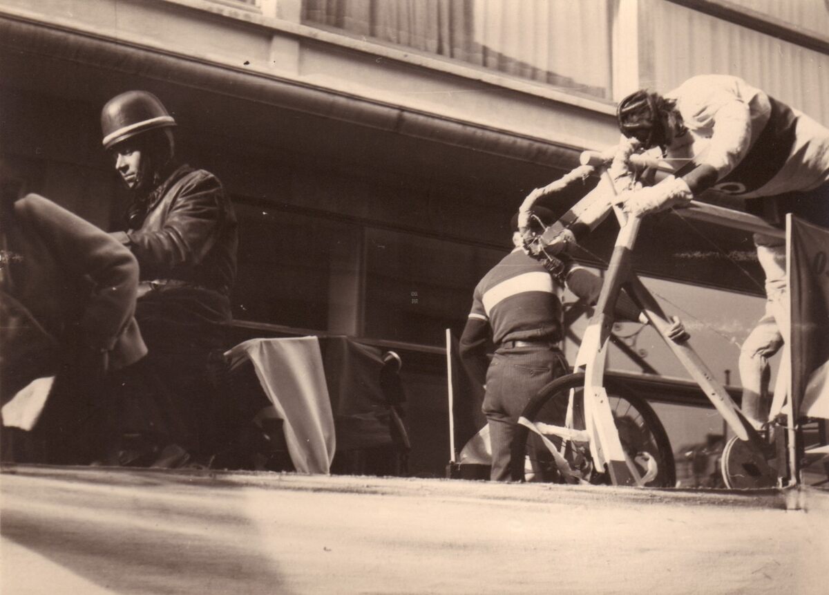 Een praalwagen uit een carnaval(?)stoet met een renner achter een moto (stayer).