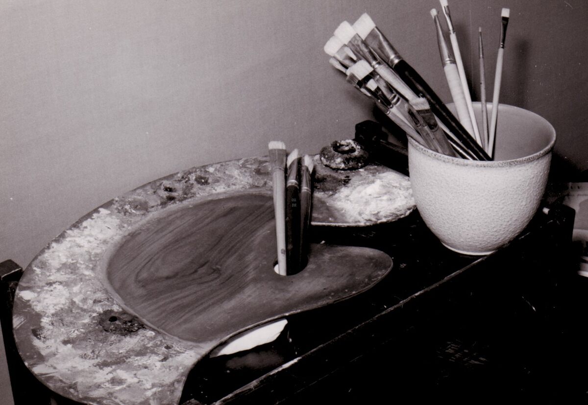 Het palet en penselen van kunstschilder Frans REGOUDT.