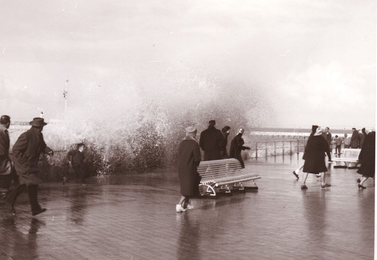 Kijkers genieten van het schouwspel van het overslaand water aan de Albert I Promenade.