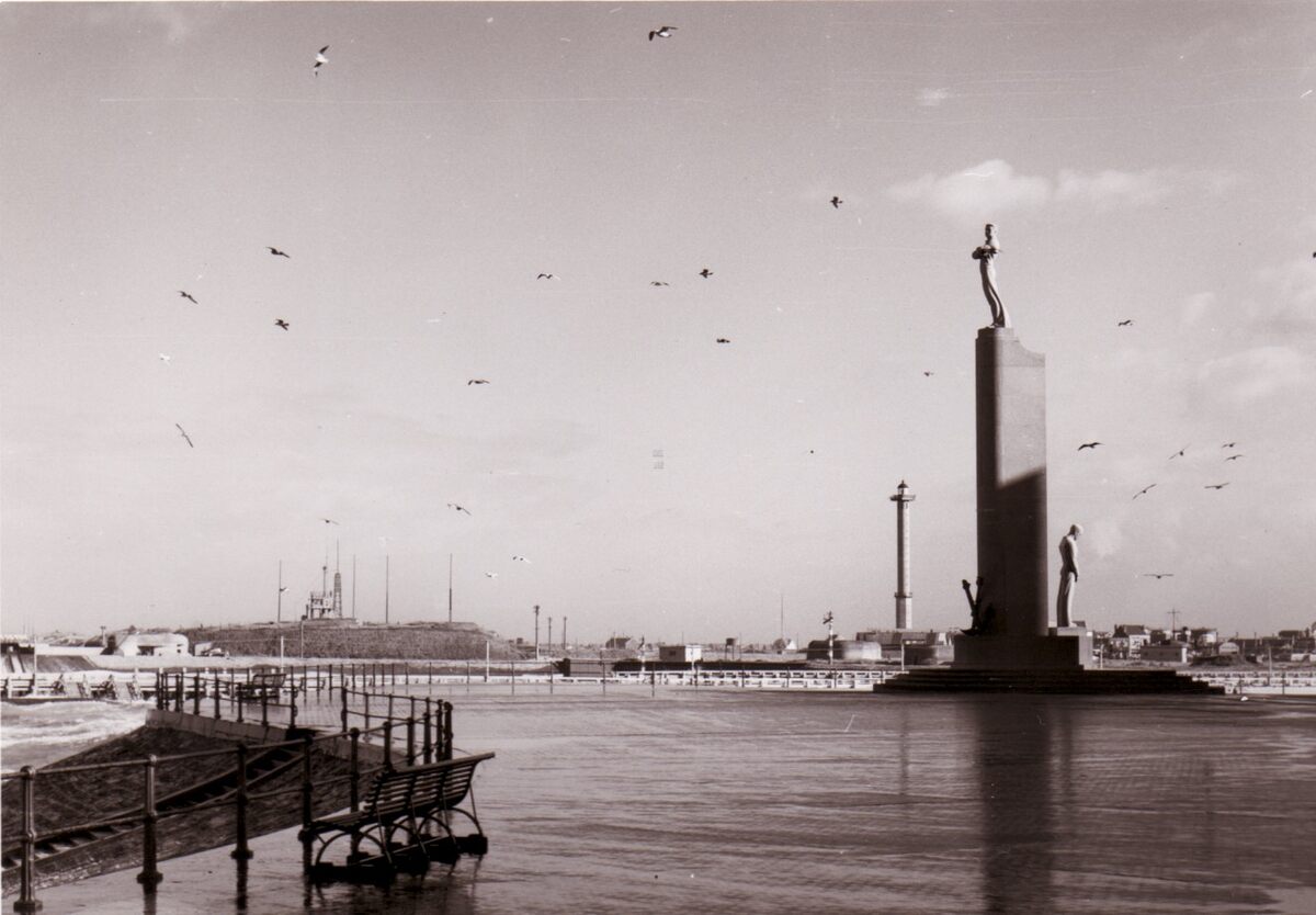 Meeuwen hangen boven het Zeeheldenplein bij een stevig briesje.