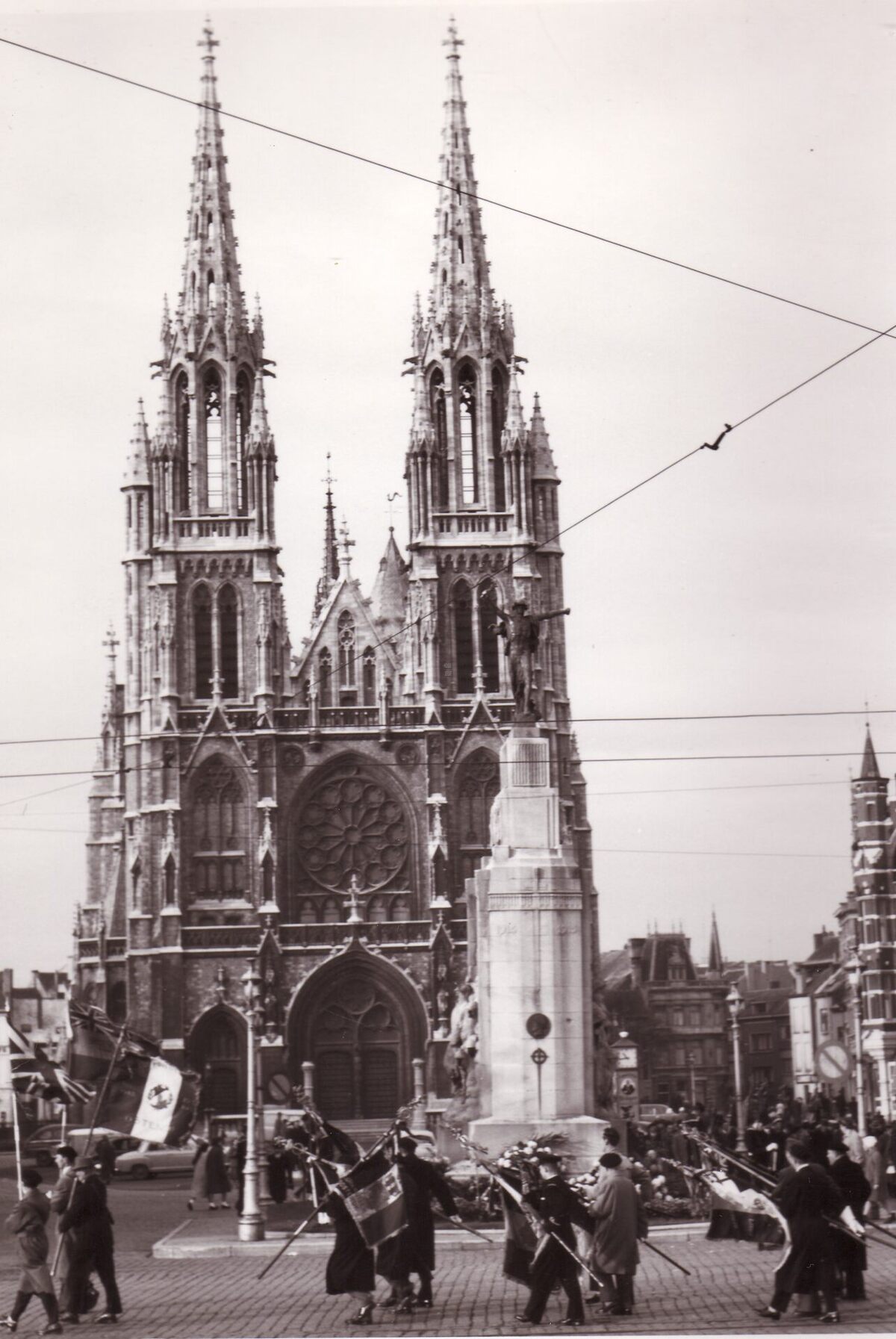 Formaat : 18 x 13 cm. - Defilé van oudstrijders mmet vaandels aan het monument voor de oorlogsslachtoffers op het Sint-Petrus- en -Paulus plein.