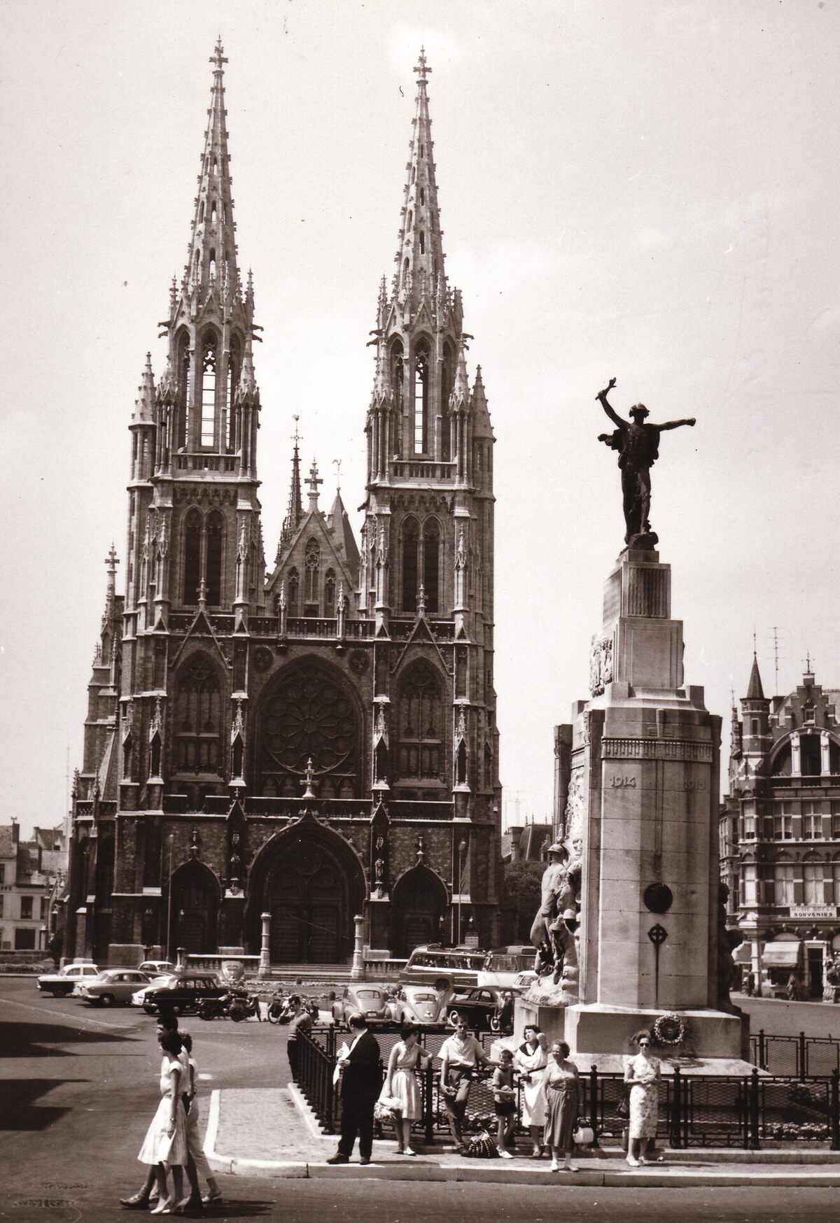 Formaat : 18 x 13 cm. - Het Sint-Petrus- en -Paulusplein met op de achtergrond de gelijknamige kerk en vooraan het monument voor de oorlogsslachtoffers.