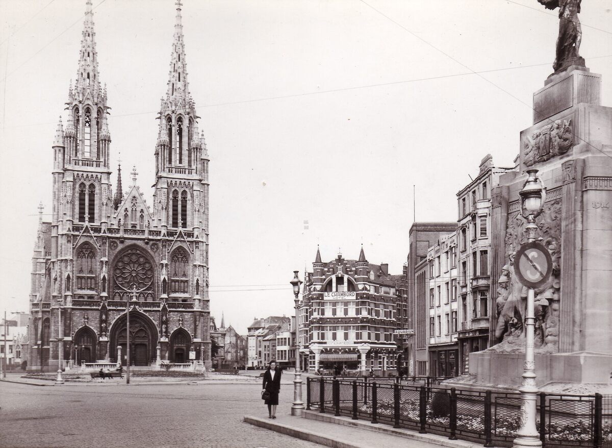 Formaat : 13 x 1= cm. - Zijkant van het monument voor de oorlogsslachtoffers op het Sint-Petrus- en -Paulusplein. Rechts het zeemanshuis en aquarium op de hoek met de Paster Pypestraat. Rechts op de achtergrond, op de hoek van de Boudewijnstraat en de Kaaistraat Hôtel Le Chambord