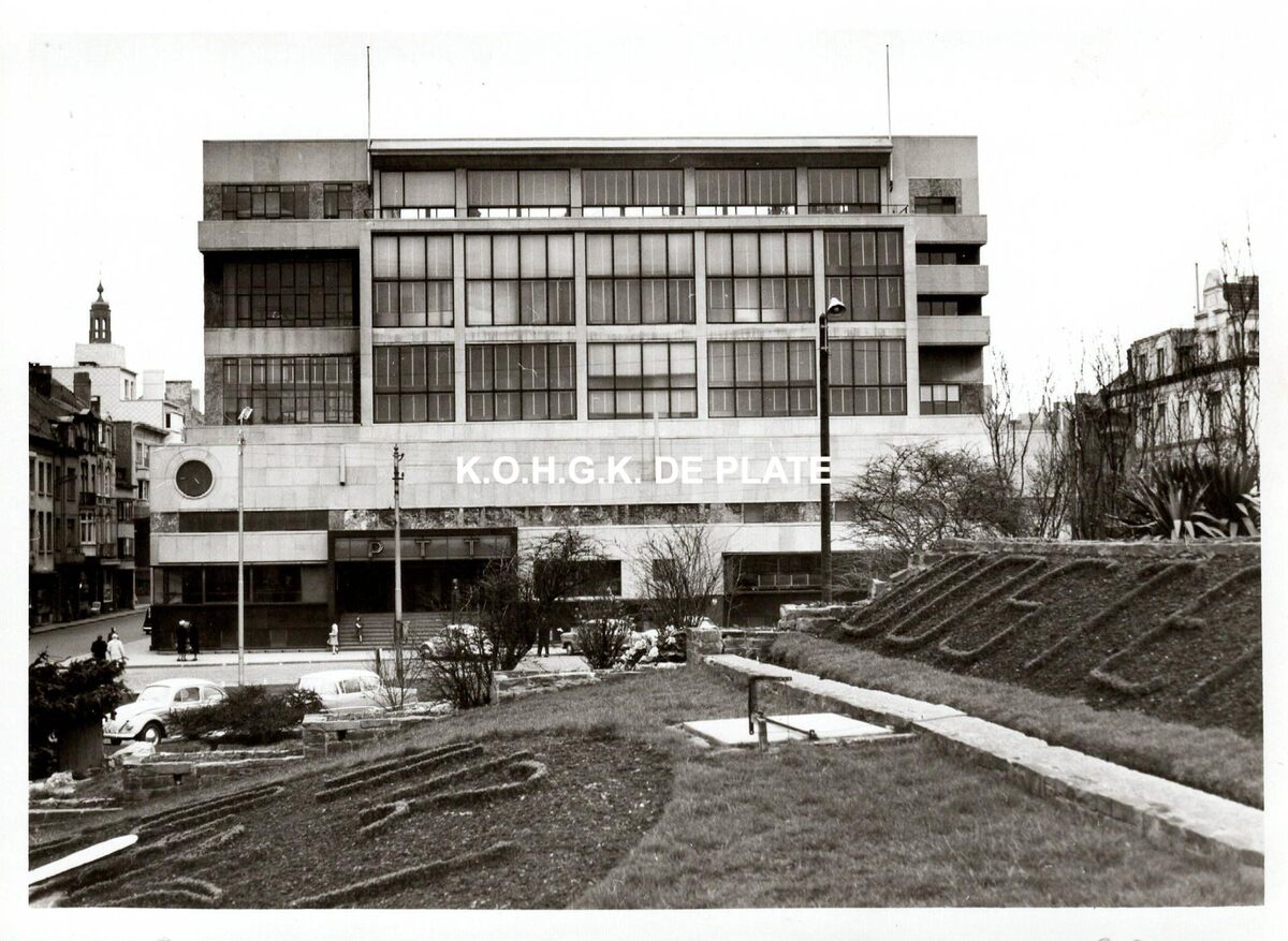 Formaat : 13 x 18 cm. - Het postgebouw aan de Hendrik Serruyslaan, gezien van aan het bloemenuurwerk (voorgrond). Links de Wittenonnenstraat en rechts de Poststraat.