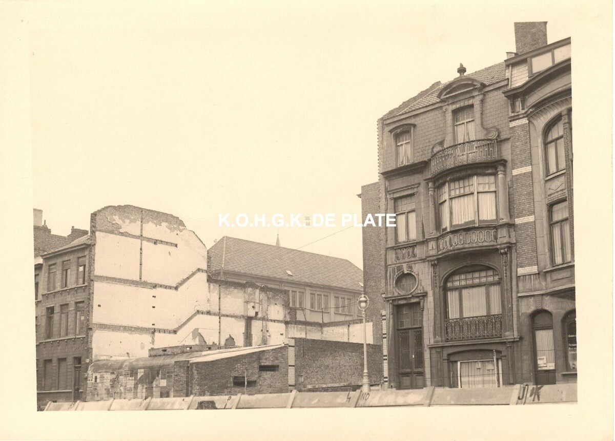 Formaat : 13 x 18 cm. Bunker uit de Tweede Wereldoorlog tusen de huizen in de Poststraat. Achteraan een vleugel van de Rijks Middelbare School voor meisjes of in de volksmond de "Ecole Moyenne".