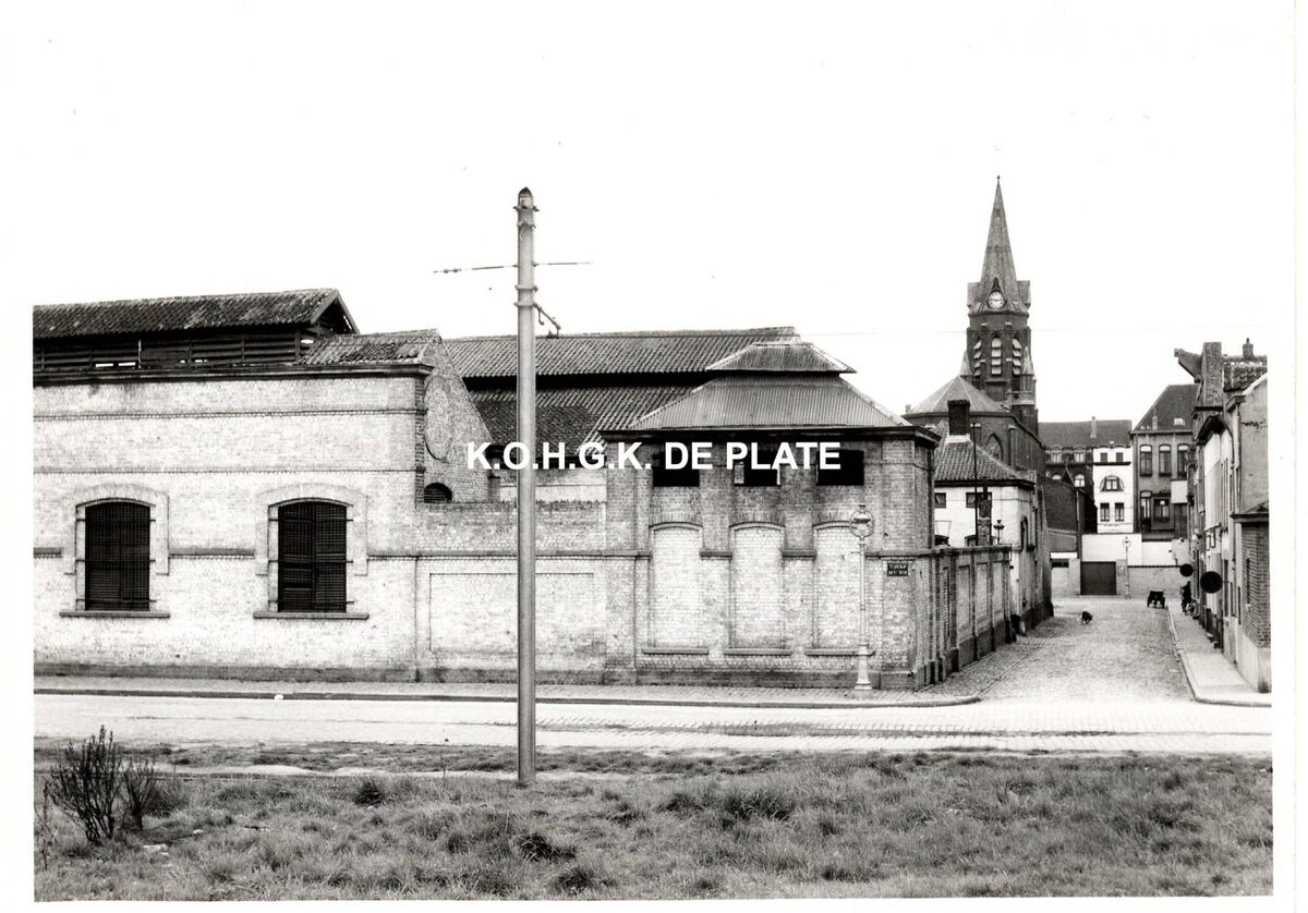 Formaat : 13 x 18 cm. - Het oud slachthuis aan de Brandariskaai.Op de achtergrond de Fregatstraat met de intussen verdwenen kerk van het Hazegras (Onze Lieve vrouw Onbevlekte Ontvangenis). Een doorkijkje in de Vooruitgangstraat (rechts).