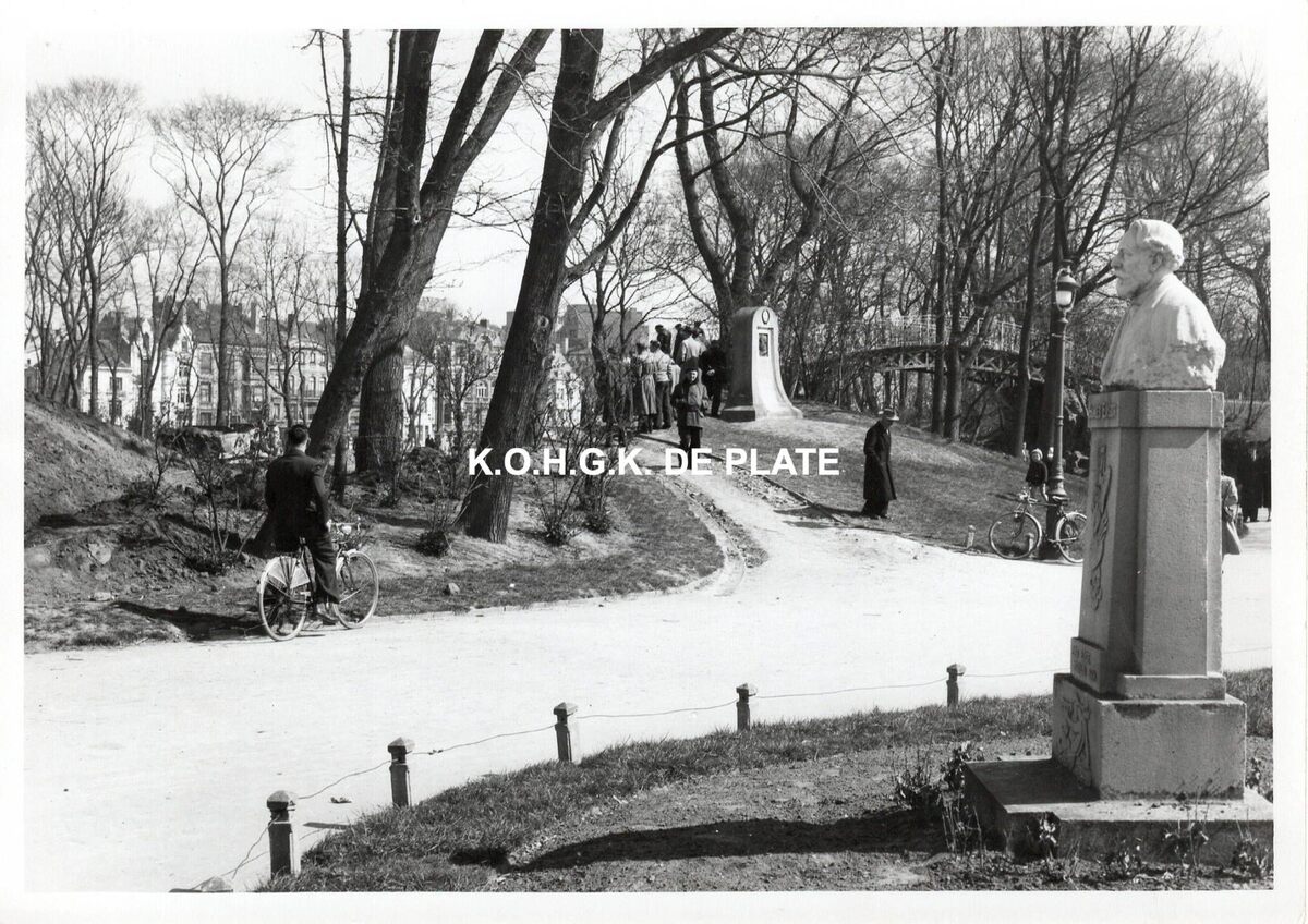 Formaat : 13 x 18 cm. - Het Leopoldpark met vooraan het borstbeeld van James Ensor door Edmond de Valeriola. Wat verder het Memoriaal Gustin Malfeyt en rechts de ijzeren brug die de verbinding vormde tussen de Trinkhall en de fontein. Op de achtergrond de Hendrik Serruyslaan.