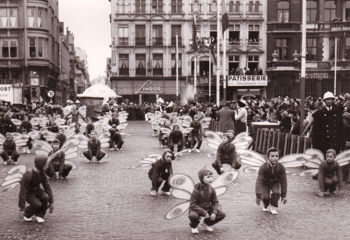 De jeugdgroep "De Blauwe Vlinders" in een stoet op het Wapenplein. Op de achtergrond de Sint- Sebastiaanstraat, en op de hoek links met de Kapellestraat, een reclameklok.