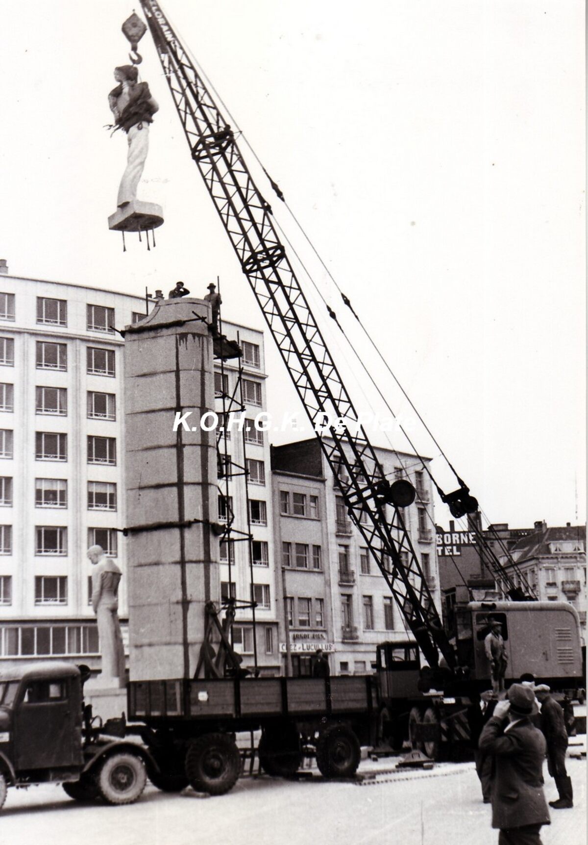 Formaat : 10 x 15 cm. - Bouw van het monument op het Zeeheldenplein. Opgericht in 1953-1954 naar ontwerp van Willy Kreitz op dezelfde plaats van de oude vuurtoren. Beschermd als monument bij MB van 26/05/2005