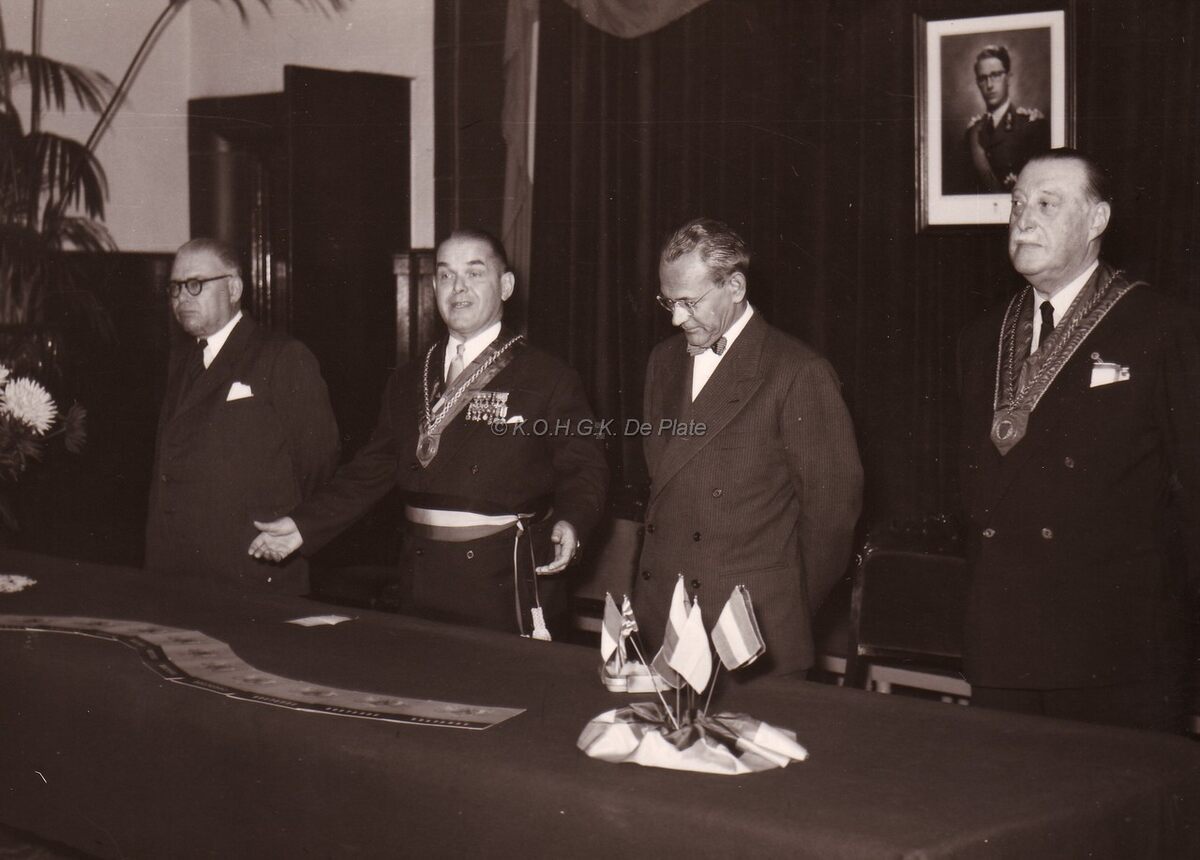 Burgemeester Adolf VAN GLABBEKE bij de ontvangst van een vereniging op het dd. stadhuis (huidig Gerechtshof), rechts van hem schepen Frans VAN CAILLIE. Links van de burgemeester de heer Henri SMISSAERT, provincieraadslid.