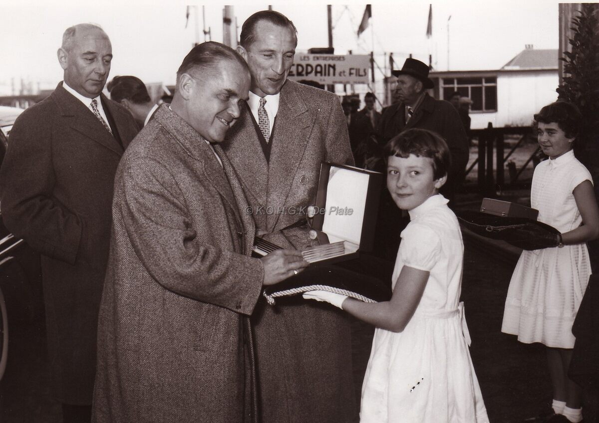 Werfbezoek door burgemeester Adolf VAN GLABBEKE, achter hem schepen Kamiel DEHOUCK. Duin en Zee ?