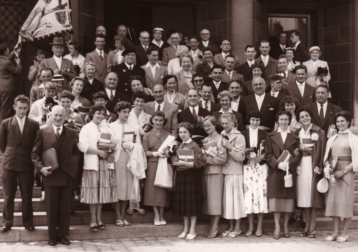 Burgemeester Adolf VAN GLABBEKE op de stoep van het dd. stadhuis (huidig Gerechtshof) na ontvangst van het Koninklijk Van Neste Genootschap uit Oostende, met vlag. Ook schepen Maurice QUAGHEBEUR is er (rechts naast de burgemeester).