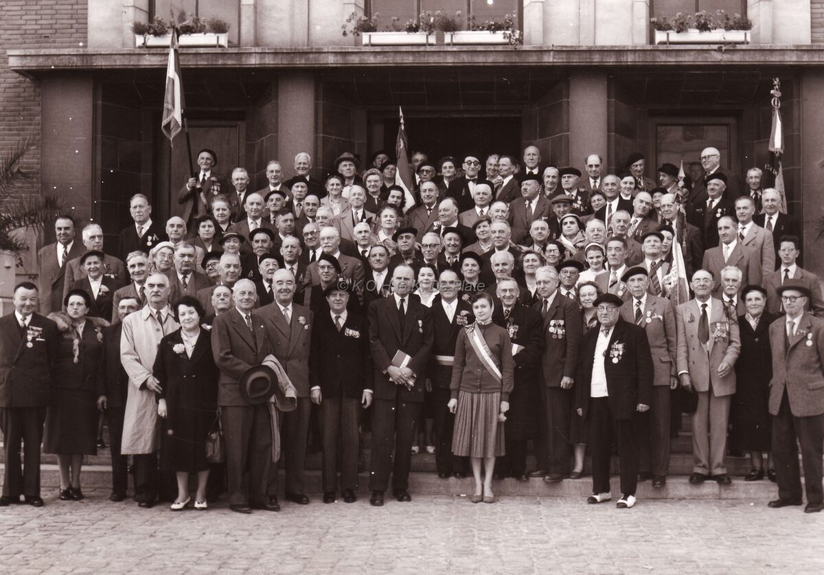 Burgemeester Adolf VAN GLABBEKE na ontvangst van een groep gedecoreerde oudstrijders, compleet met "berets" en vaandels op de trappen van het dd. stadhuis (huidig Gerechtshof).