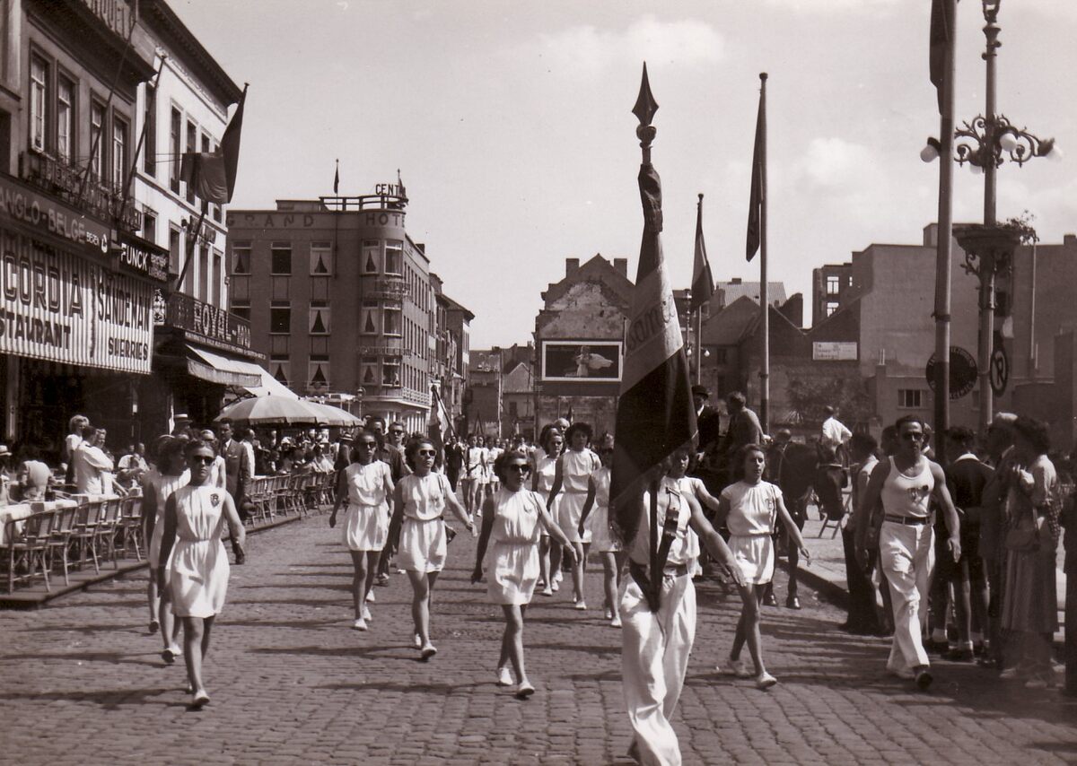 Een turnvereniging stapt op in een stoet op het Wapenplein. Links hoek Louisastraat met Brabantstraat. Er is nog veel puin uit de Tweede Wereldoorlog te zien. Op de achtergrond Grand Hotel Central