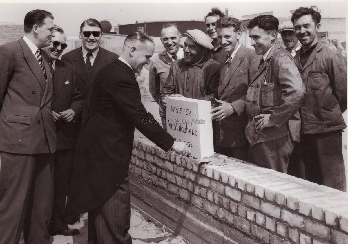 Adolf VAN GLABBEKE, toen minister van Openbare Werken, plaatst de eerste steen van N.V. Morubel visverwerkend bedrijf aan de Fort en Napoleonstraat. Achter hem zien we de zonen VAN COILLIE van de gelijknamige aannemersfirma.