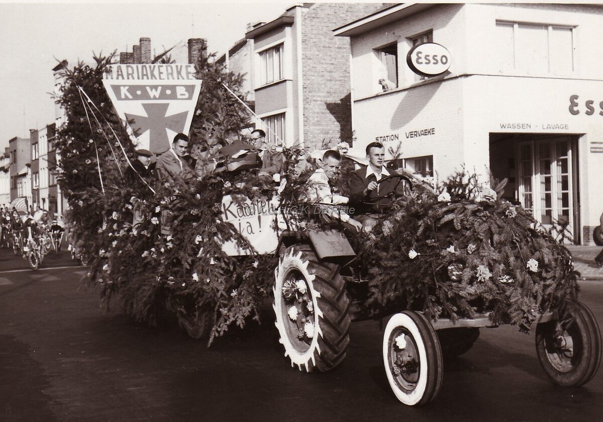 Een praalwagen van de KWB Mariakerke in de stoet op de Nieuwpoortsesteenweg ter hoogte van het Esso tankstation Vervaeke, op de hoek met de Elisabethlaan. Het Esso tankstation werd uitgebaat door Marcel Vervaeke en zijn echtgenote Odette Gombert van 1954 tot 1982.