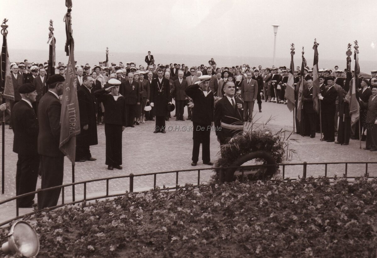 Burgemeester Adolf Van Glabbeke legt een krans neer aan het Leopold II-monument , naar aanleiding van de Koloniale Dag. Centraal wat naar achter, met ambtsketting, deurwachter Henri Lanoye.