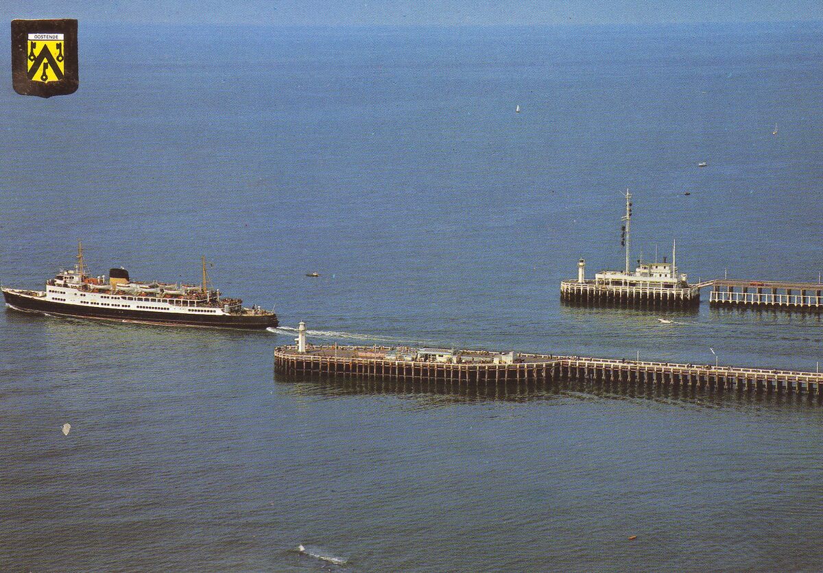 J.V.D.B., N° 102/33. - Luchtopname. Vooraan zien we detail van het Weststaketsel met op het einde het ijzeren lichttorentje met mistbel en het café-paviljoen. Aan de overzijde, detail van het Ooststaketsel met tijseinpost