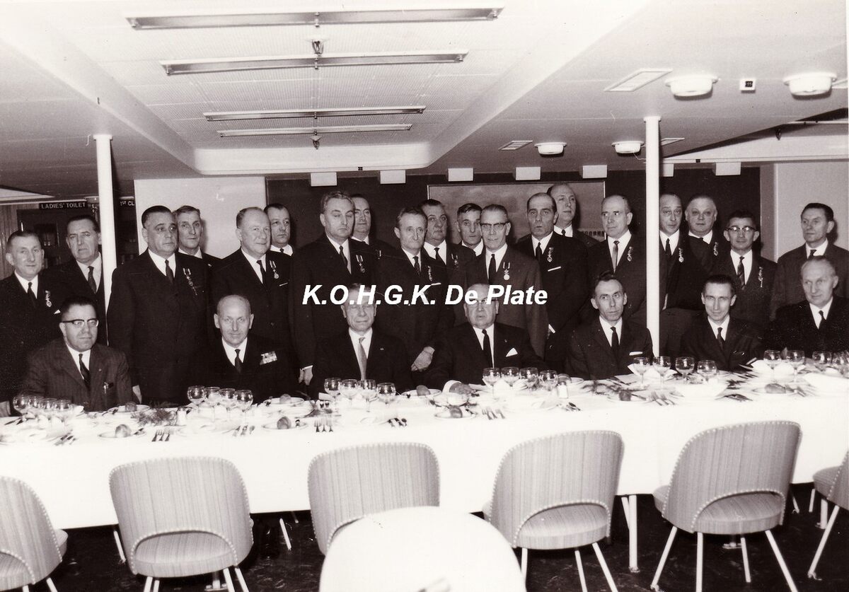 Afdruk, formaat : 29.5 x 21 cm. - Het personeel van de catering van de Wagons-Lits worden gevierd aan boord van de pakketboot "Koningin Elisabeth". Zittend links, W. Thomas, vierde, R.L.Peeters. Muyldermans, Buras (commercieel directeur zeewezen ), Van Vaerenbergh Fr. (nautisch directeur zeewezen). Staande links, Degroote, derde, G. Deschepper, zevende, J. Van Troostenberghe.