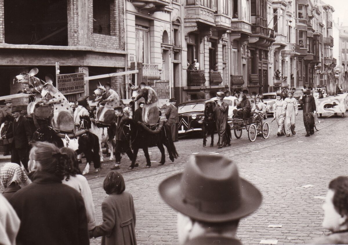 Een carnavalstoet met thema "Rat Mort" komt aan op het Leopold I plein uit de Van Iseghemlaan.