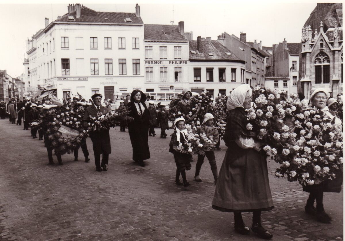 Een vaderlandse stoet in de Jozef II- straat. Rechts de Sint-Pietersstraat met in het wit gebouw het gekende Instituut Meysmans, waar generaties Oostendse meisjes, vooral meisjes, steno en dactylo leerden. Ernaast Pension Philippe.