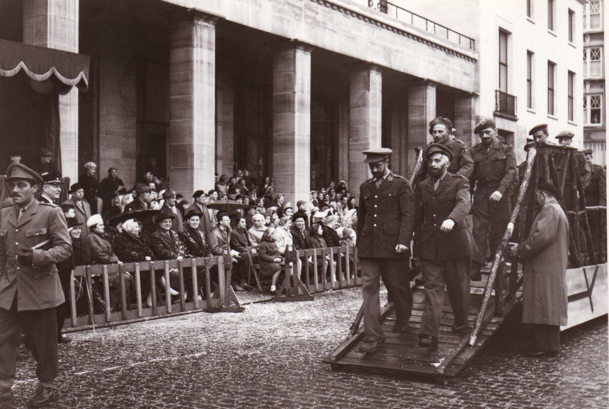 Een militaire (?) groep in de carnavalstoet aan het feestpaeis op het Wapenplein.De straat ligt al vol confetti.Centraal vooraan burgemeester Jan PIERS en schepen John LAUWEREINS.