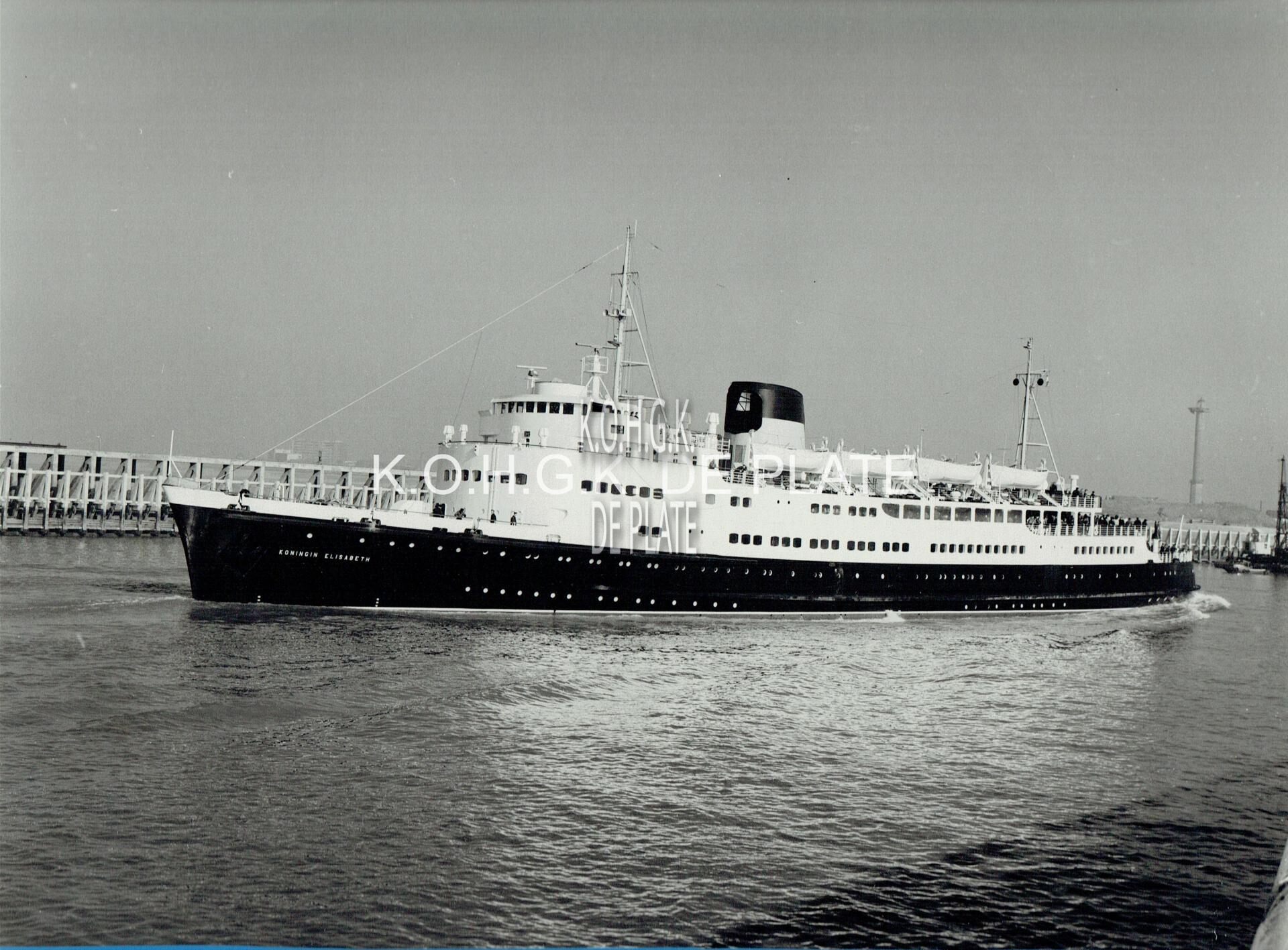 Formaat : 22 x 30 cm. - De pakketboot "Koningin Elisabeth" vaart de haven van Oostende binnen. Op de achtergrond het Ooststaketsel. Gebouwd en te water gelaten op de werf "Cockerill-Ougrée" te Hoboken op 29 oktober 1956 en afgeleverd op 8 maart 1957. De meter van het schip was Koningin Elisabeth. Het schip was uitgerust met een kunststof bekleding op de stalen dekken (Dex-o-tex), ter vervanging van hout. Dit om gewichtsbesparingen en omdat houten dekken zeer duur zijn.