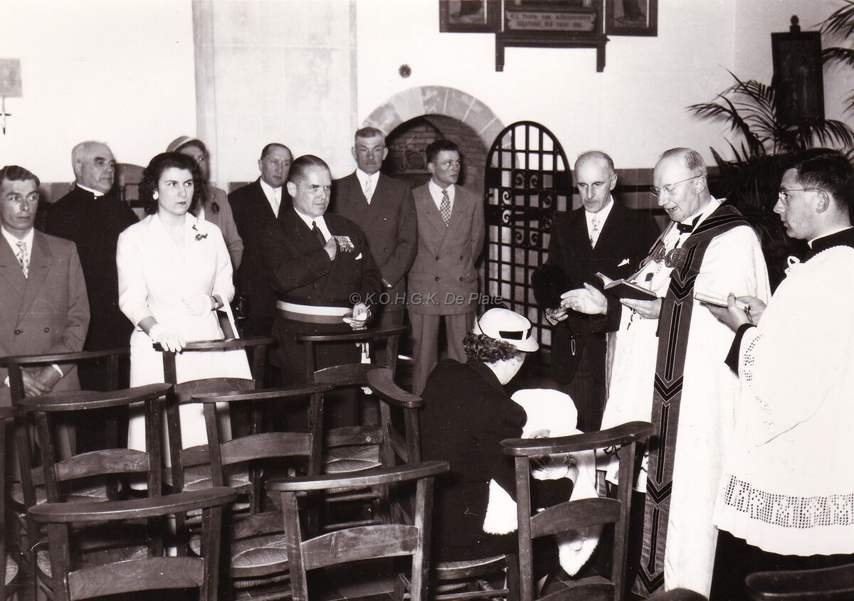 Burgemeester Adolf VAN GLABBEKE op de doop door pastoor Henri DIET, van een kind (het 9e ?) uit een kroostrijk gezin in de Sint-Antoniuskerk. Links achteraan staat deken BUTAYE. Zie ook foto 2012/0303.
