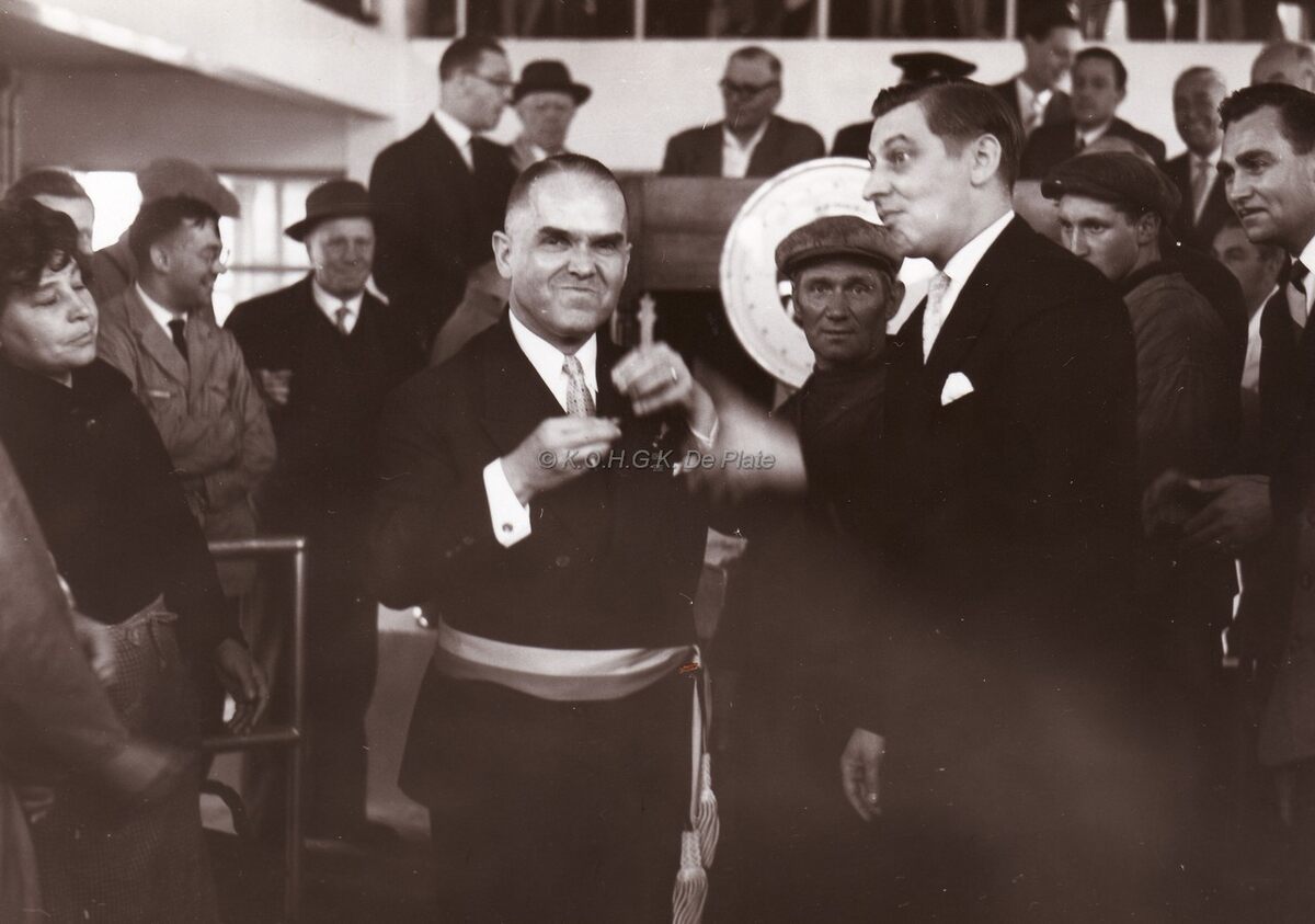 Inhuldiging door burgemeester Adolf Van Glabbeke van de garnaalmijn. Uiterst rechts Frank Zanders, secretaris-ontvanger van de vissershaven.