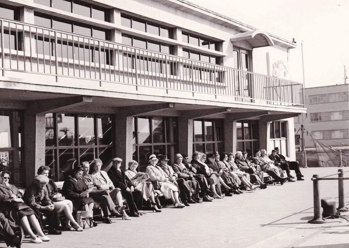 Formaat : 13 x 18 cm. - Mensen genietend van de zon aan de zijgevel van de garnaalmijn aan de Visserskaai.