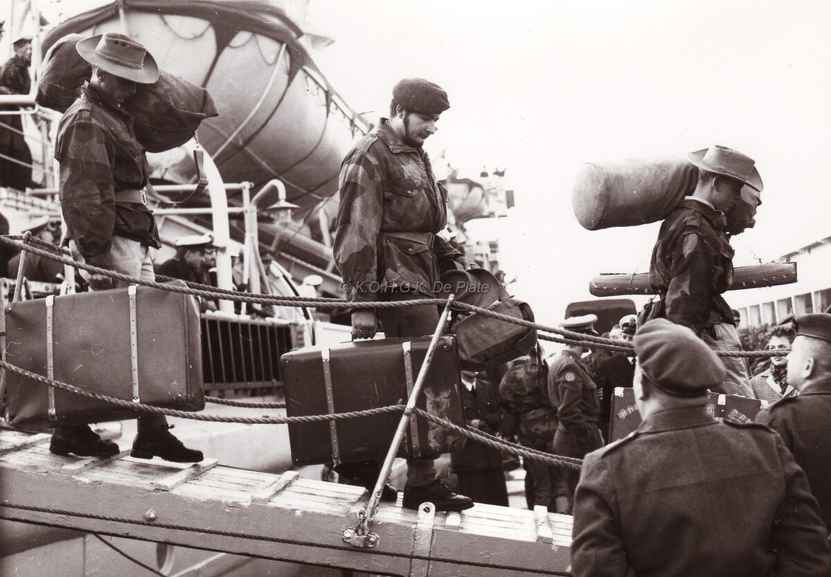 Ontscheping door de troepen die terugkwamen uit Congo.Ze dalen de loopbrug van het troepentransportschip "Kamina" af naar de Natienkaai.