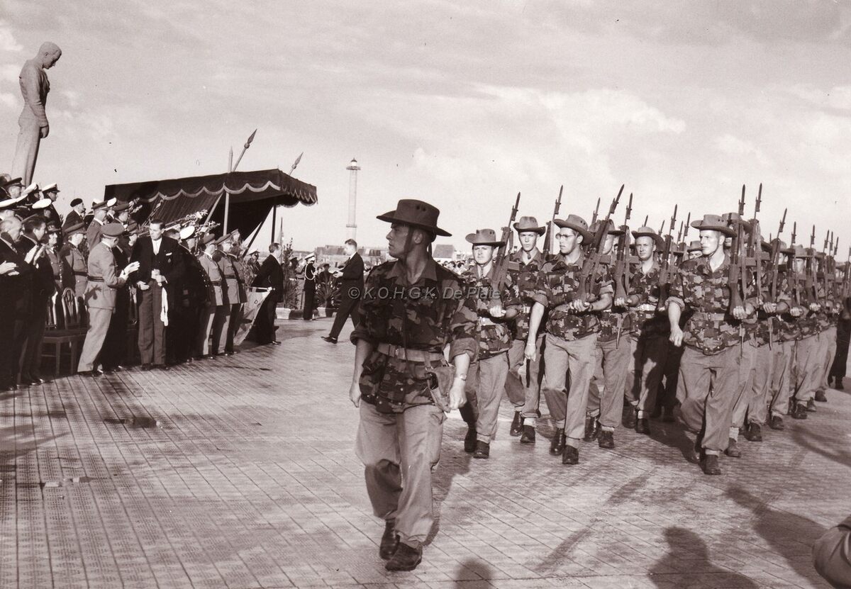De teruggekeerde troepen, uit Congo defileren voorbij het monument der zeelieden en de eretribune op de Zeedijk.Centraal herkennen we burgemeester Jan Piers en 2e van links Roger Dekinder schepen.
