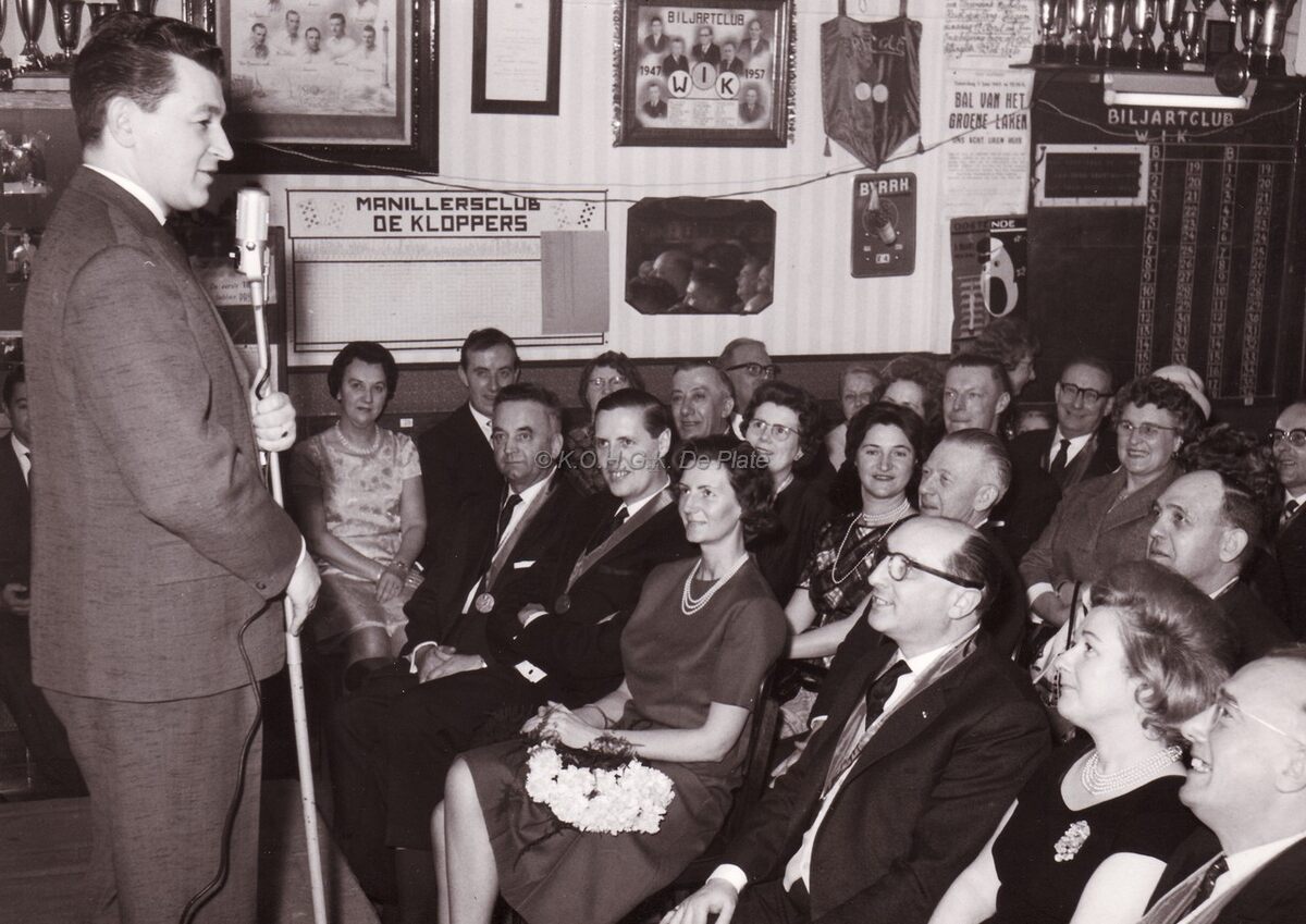 Toni CORSARI entertaint in het lokaal van biljartclub "Willen is Kunnen" en manillersclub " De Kloppers" in de Sint Sebastiaanstraat (?).Vooraan op de eerste rij de heer en mevrouw Jan PIERS (burgemeester).Zelfde foto als 2012/0182.