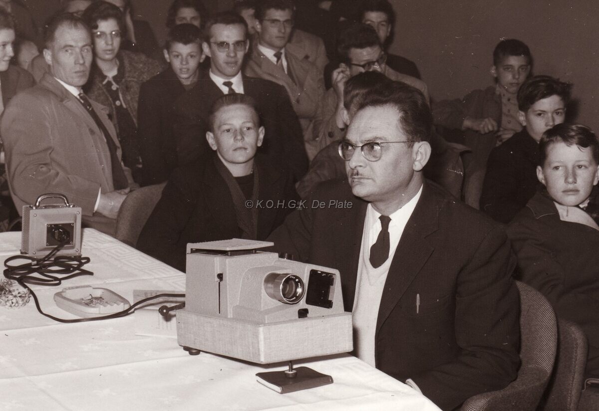 Stadsconsevator Frank EDEBAU met projectietoestel tijdens een voorstelling.