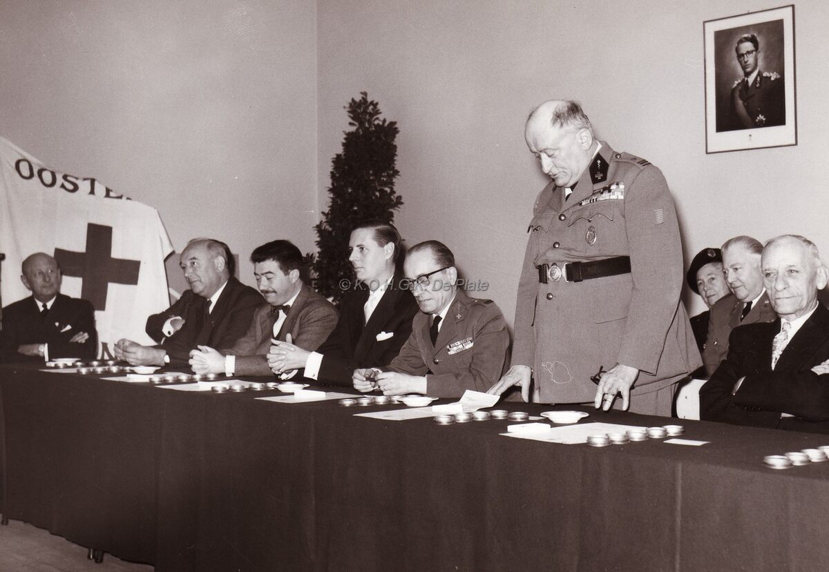 De tafel met de notabelen bij een feest van het Rode Kruis.Van links naar rechts Kamiel DEHOUCK,schepen,Roger DEKINDERR,schepen,Jan PIERS ,burgemeester onbekend, onbekend en Henri EDEBAU,schepen.